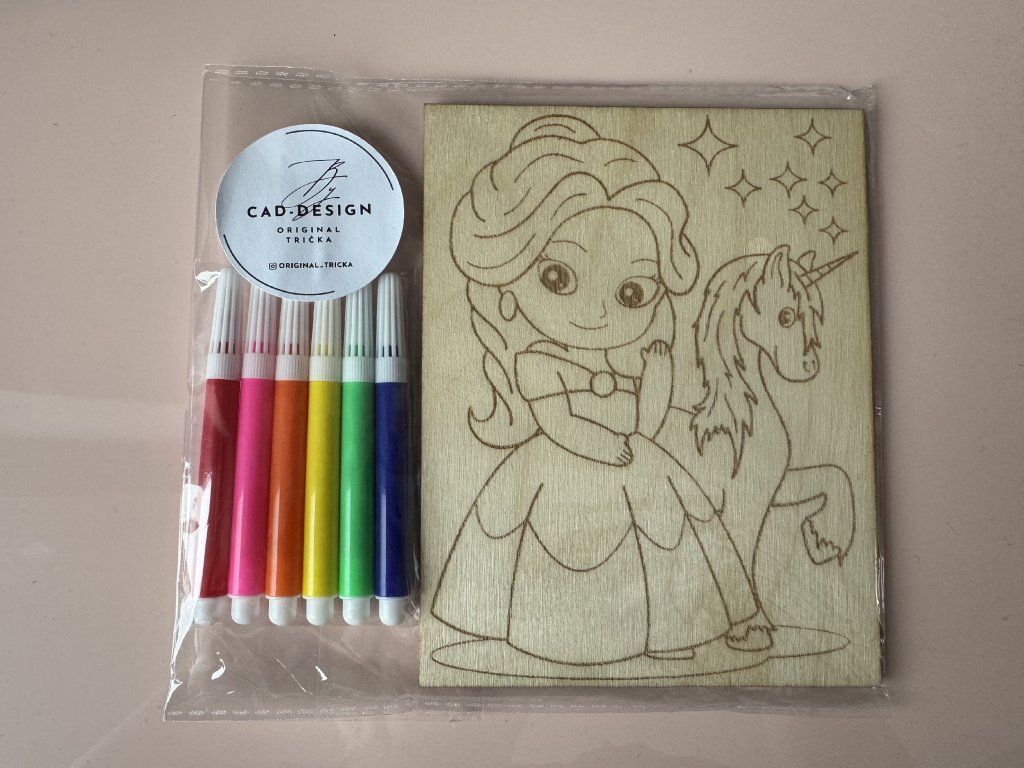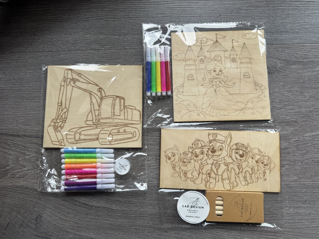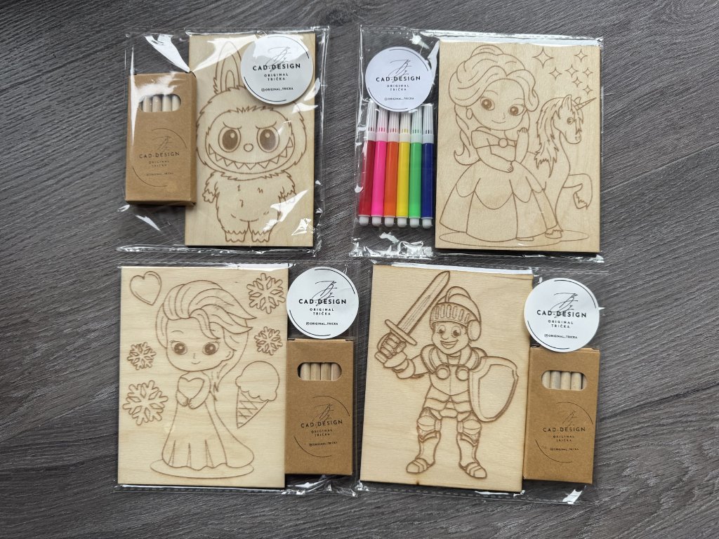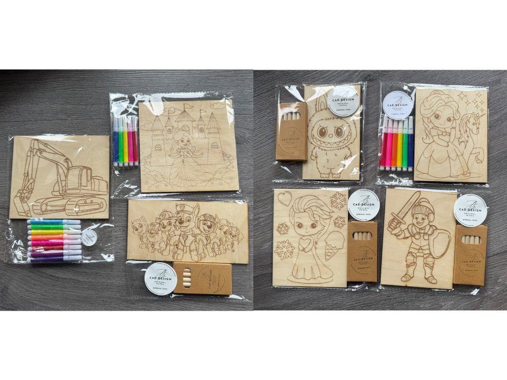 Každý motiv je vygravírovaný do dřeva – děti si ho mohou vybarvit fixami nebo pastelkami a potom si svůj výtvor vystavit jako obrázek do pokojíčku 💛