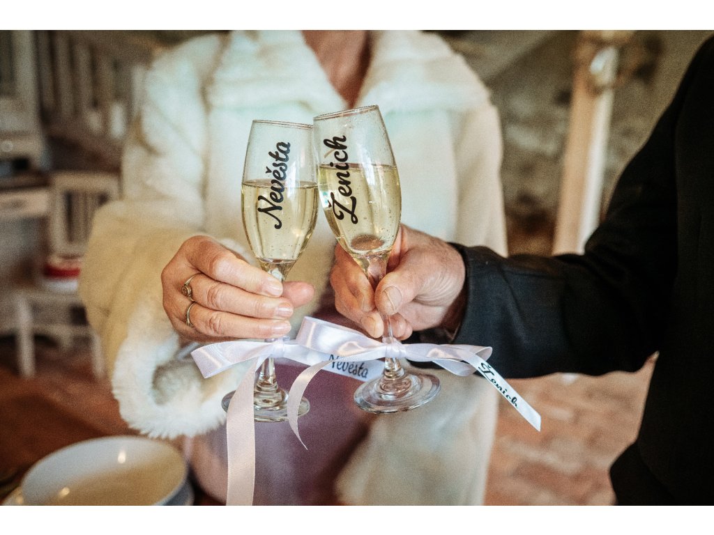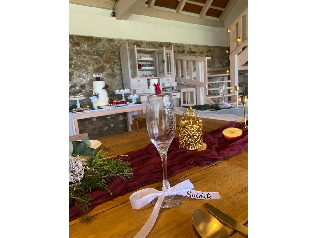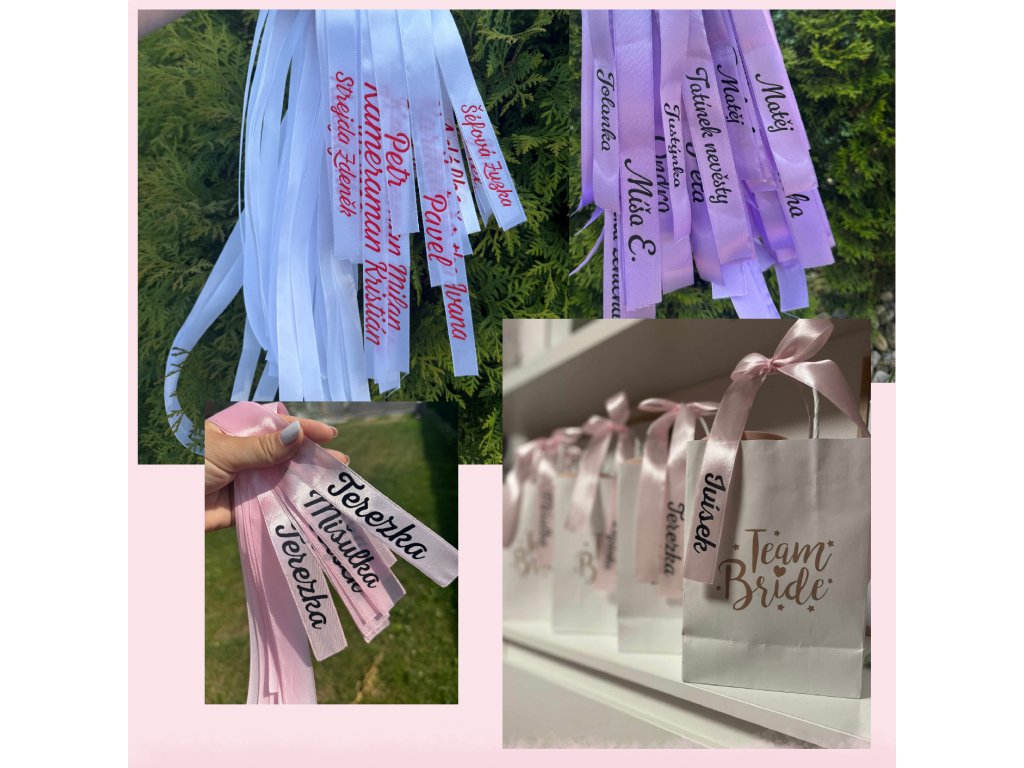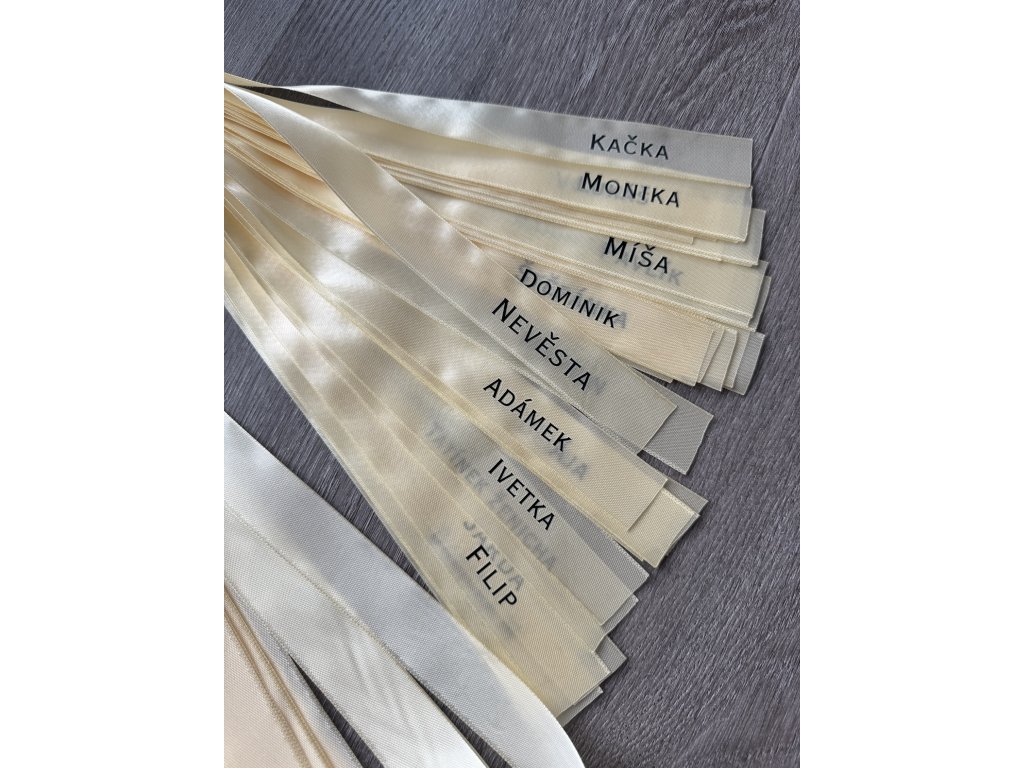 Elegantní a jemný detail, který krásně doladí svatební tabuli. Svatební stuhy se jmény slouží jako originální jmenovky pro svatební hosty a zároveň jako dekorativní prvek, který zanechá dojem.